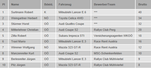 Im Rallye-Pokal der OSK, Division P2, startet der Kärntner Robert Surtmann als Tabellenführender seinen Mitsubishi Lancer Evo VI RS, doch seinem Verfolger, Herbert Weingartner auf Toyota Celica 4WD fehlen nur vier Punkte.